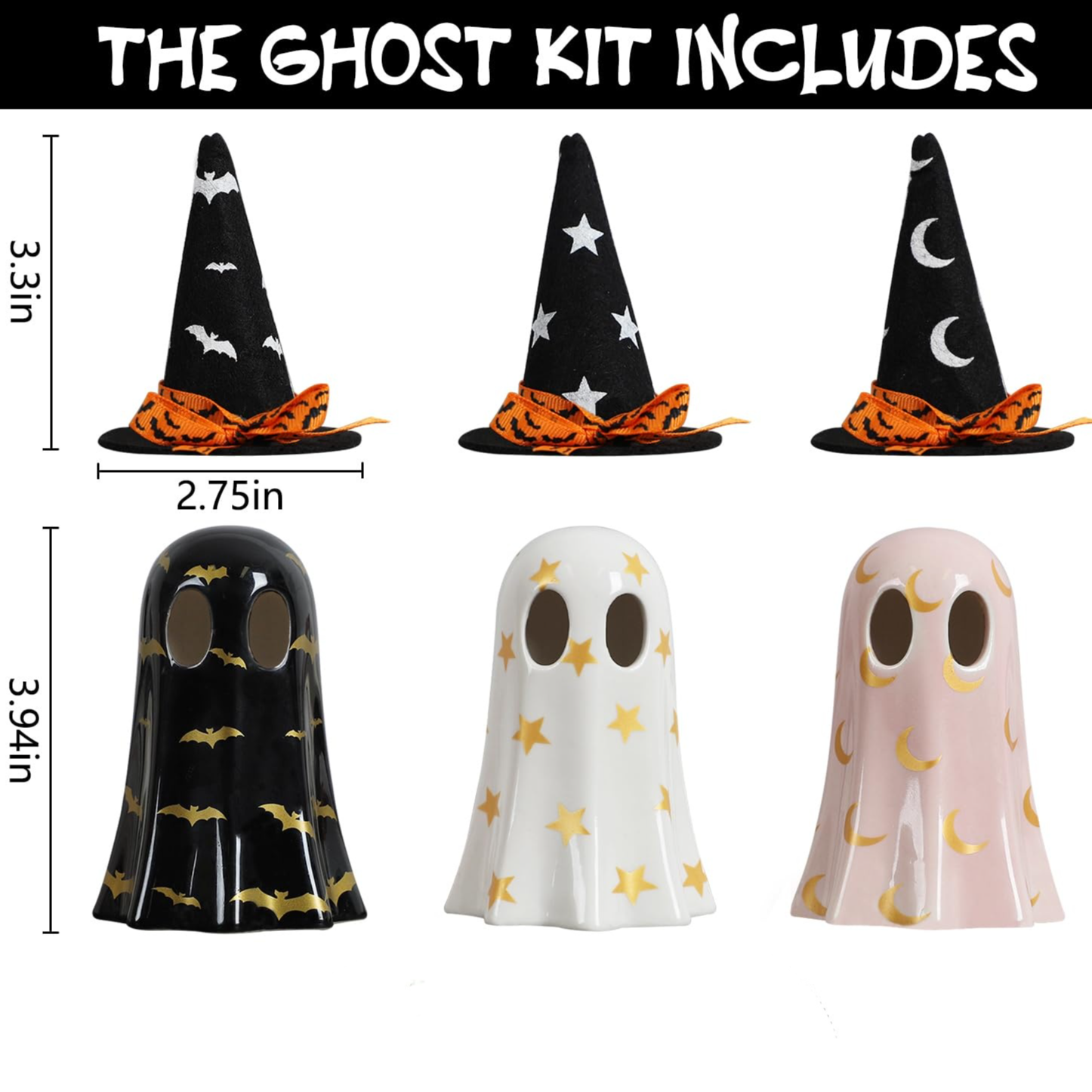 ✅Material: High-quality ceramic ghost figurines with felt witch hats